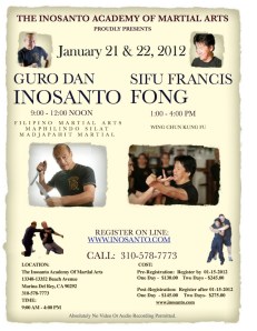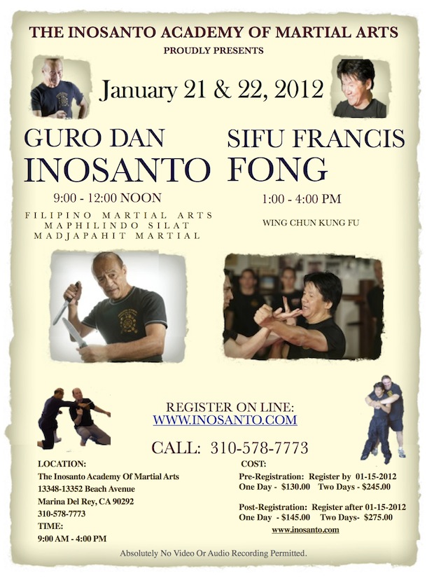 This weekend Guro Dan Inosanto and Sifu Francis Fong will be teaching a seminar at the Inosanto Academy in Marina del Rey. This is a chance to train with some of the best instructors in the world in Maphilindo Silat, Filipino Kali and Wing Chun Kung Fu. Please refer to the flier for details.