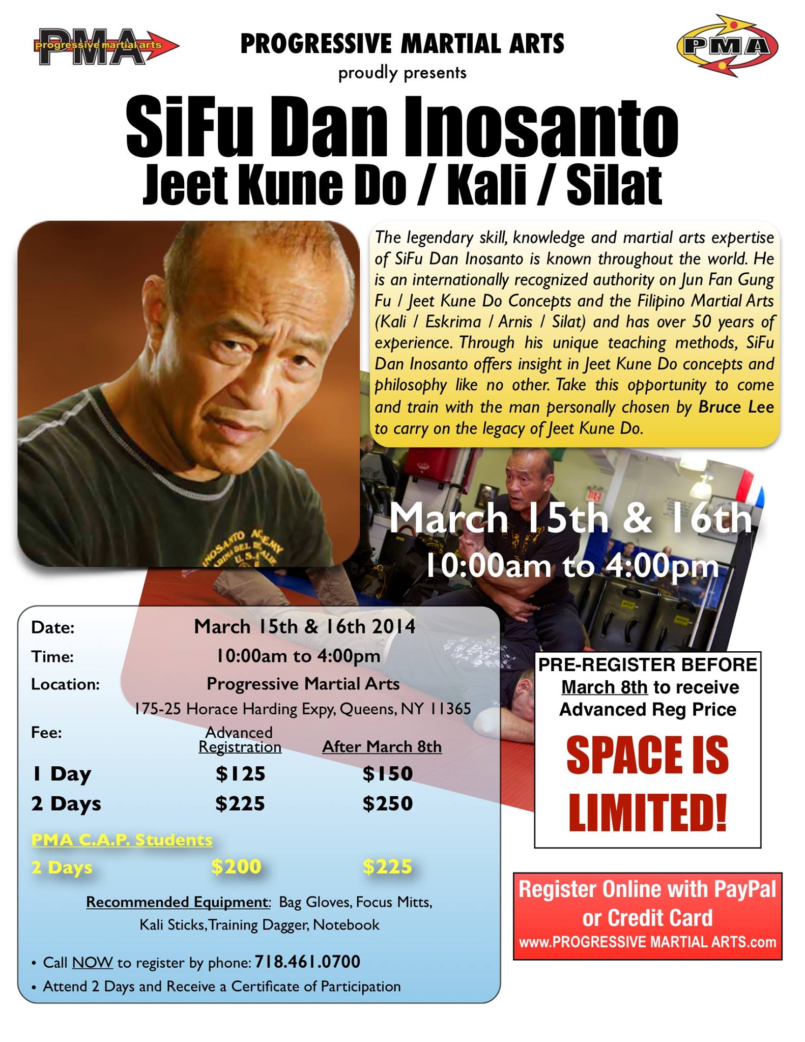 This past weekend I had the great pleasure to see and train with one of my teachers, Guro Dan Inosanto. Hosted by Guro Nick Sacoulas and Progressive Martial Arts in Queens, NY these March seminars at Progressive have become a much anticipated tradition for his students around the country.