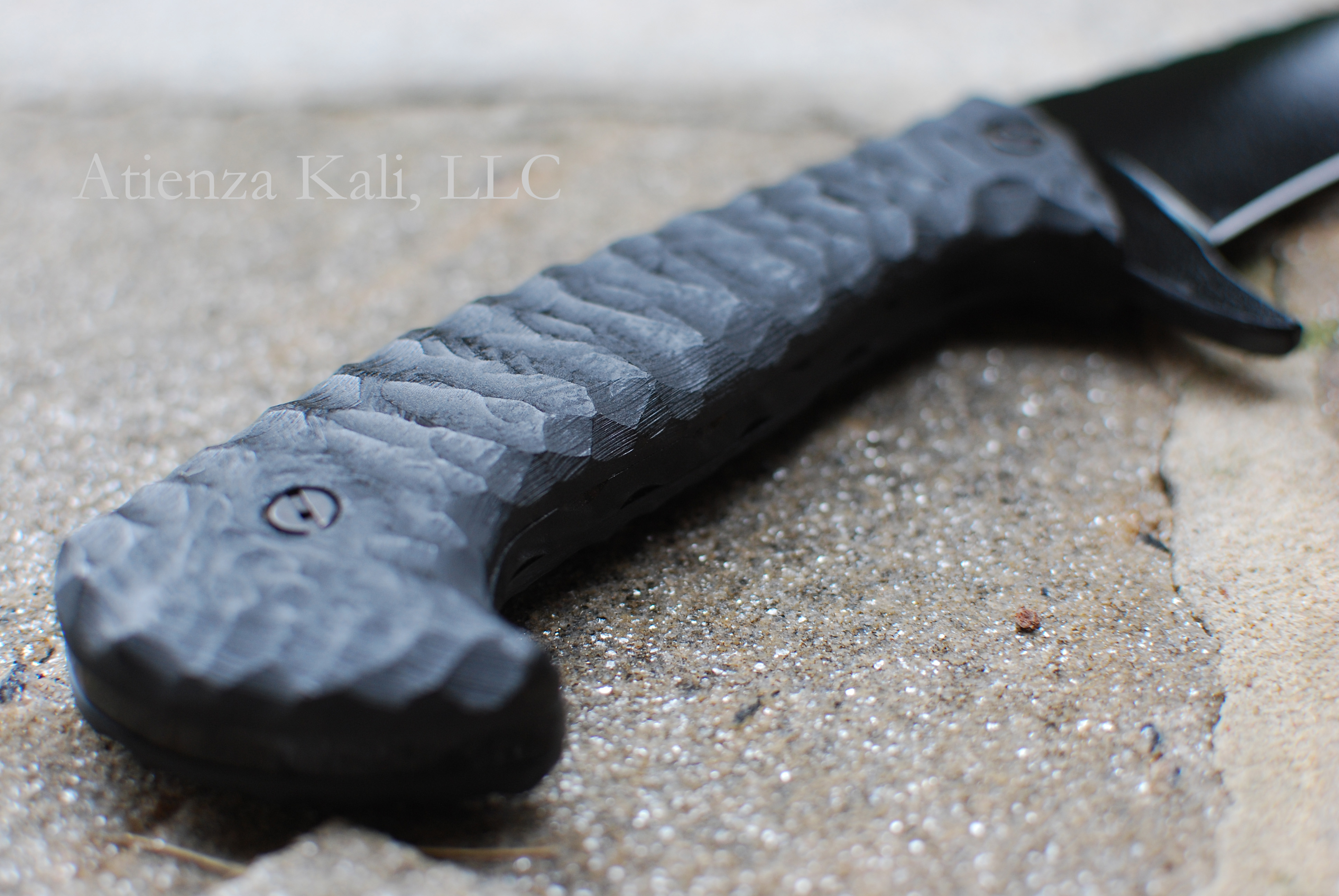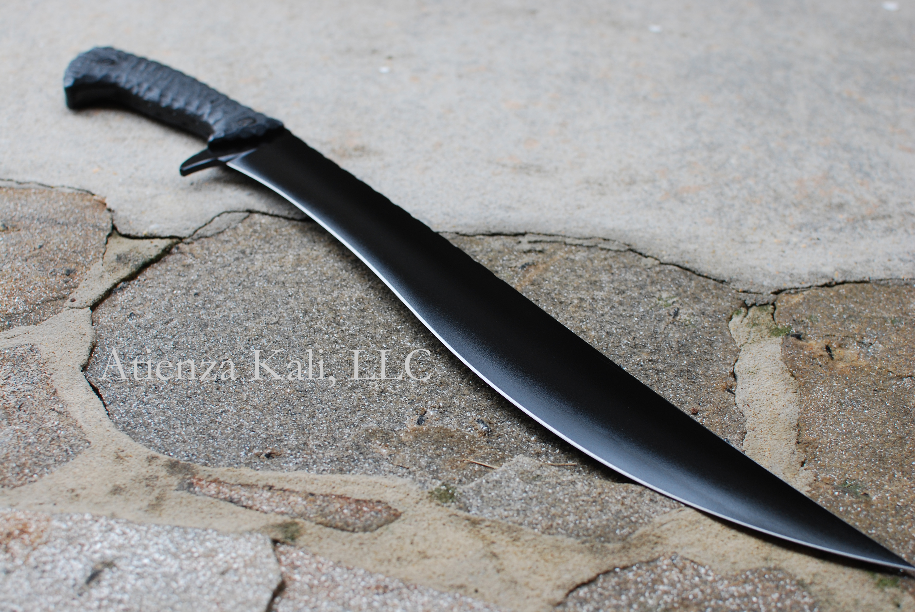 The Atienza Apocalypse is Tuhon Carl’s contribution, handmade custom 15.5″ full tang S30V matte black blade with G10 handles, with an overall length of 21.5″. From the Atienza Kali‘s description, “The Apocalypse is a contemporary long blade for the Atienza Kali practitioner and other modern swordsmen. The elegantly curved blade is distally tapered, making it quick and lively for slashes, chops and thrusts. The forward cant gives it astonishing cutting power.”