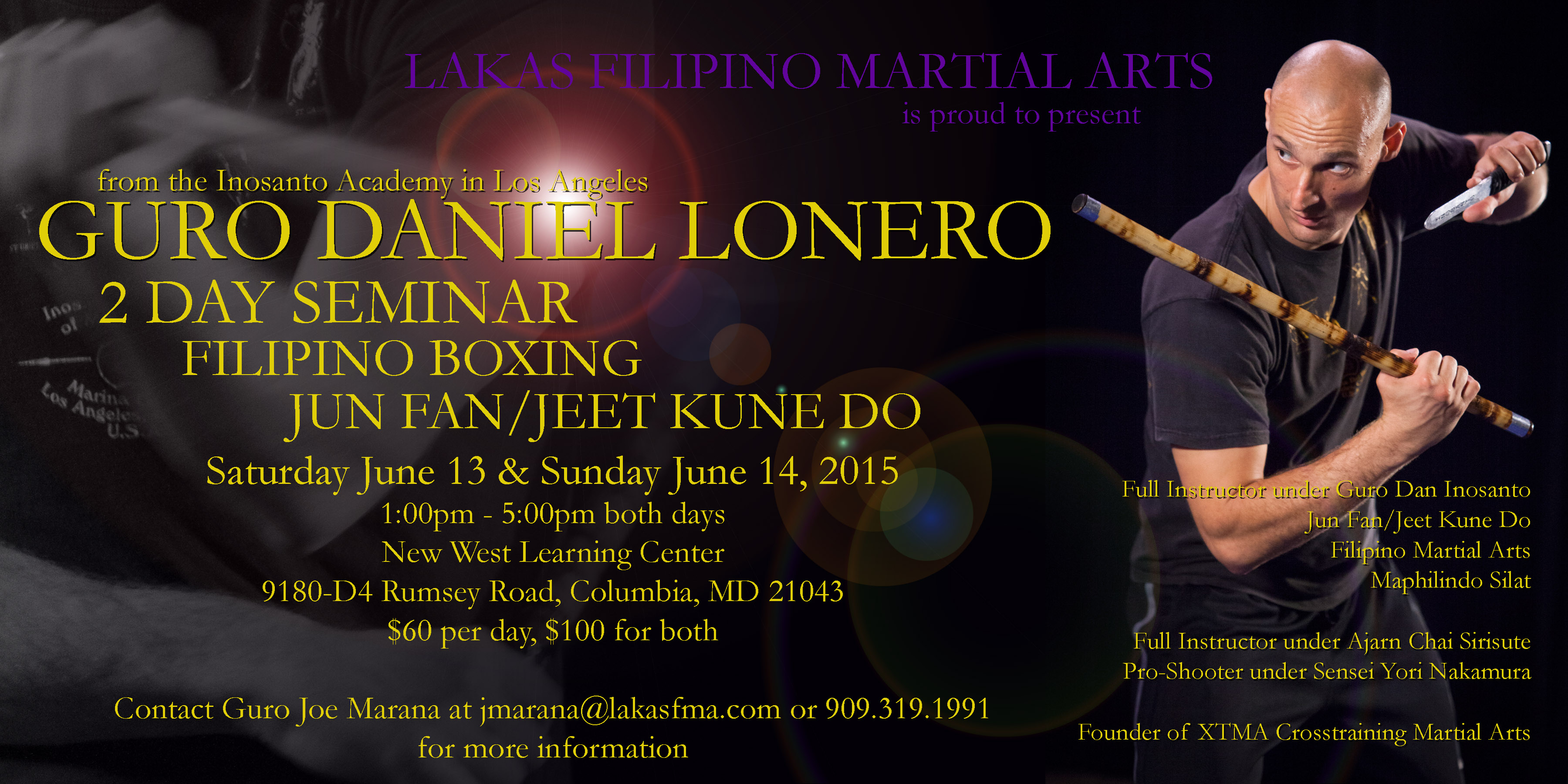 Lakas Filipino Martial Arts is proud to host Guro Daniel Lonero for a 2 Day seminar on Saturday, June 13 and Sunday, June 14. Guro Daniel is a Full Instructor in Jun Fan/Jeet Kune Do, Filipino Martial Arts & Maphilindo Silat under Guro Dan Inosanto and is one of his senior students. During my years training in Los Angeles, Guro Daniel and Guro Joel would most often be the ones to assist Guro Inosanto, and in his absence Guro Daniel would often teach class. He instructs and trains in all of the Academy classes and is always present at events, seminars and instructor camps. While I have many seniors in the Inosanto system that I admire and look up to, Guro Daniel has always been an instructor that has helped me in my own evolution. As I have told many, I believe Guro Daniel is one of the best expressions of the current Inosanto curriculum as Guro Inosanto teaches it today.